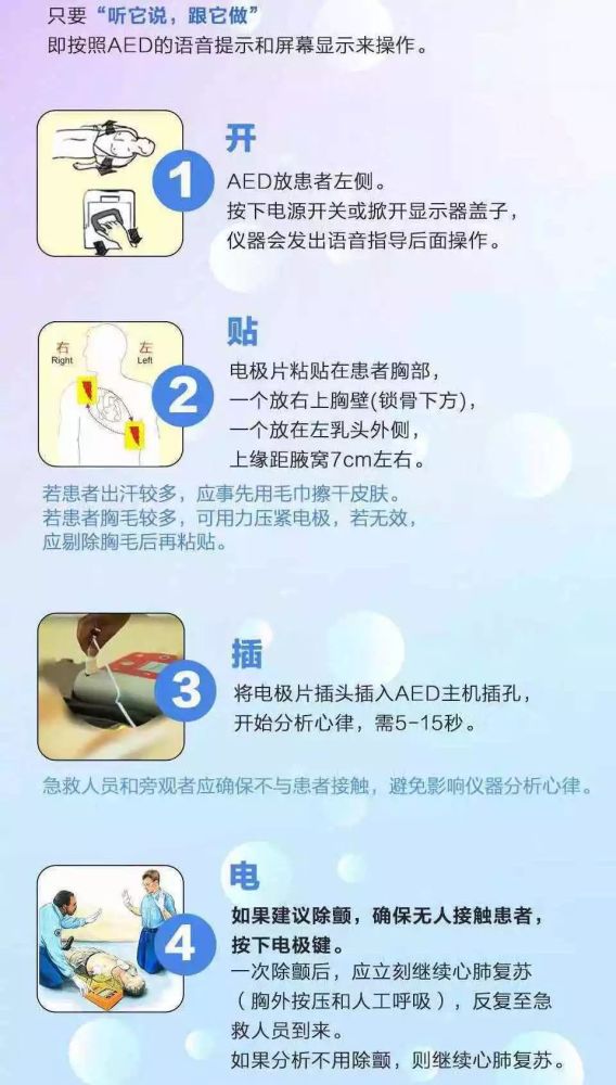 第四步:現(xiàn)場如有AED(自動體外除顫器),胸外心臟按壓之后,立即配合使用AED,按照語音提示操作,提高患者搶救的成功率。